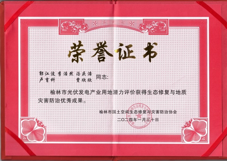 會議對生態(tài)修復(fù)與地質(zhì)災(zāi)害防治優(yōu)秀成果、先進(jìn)單位和先進(jìn)個人進(jìn)行了表彰并舉行了隆重的頒獎儀式。陜西工勘院承攬實(shí)施的《榆林市光伏發(fā)電項(xiàng)目用地潛力評價項(xiàng)目》被協(xié)會授予“優(yōu)秀成果”獎項(xiàng);陜西工勘院榮獲“先進(jìn)單位”;項(xiàng)目負(fù)責(zé)人郭江波獲“先進(jìn)個人”榮譽(yù)稱號。
